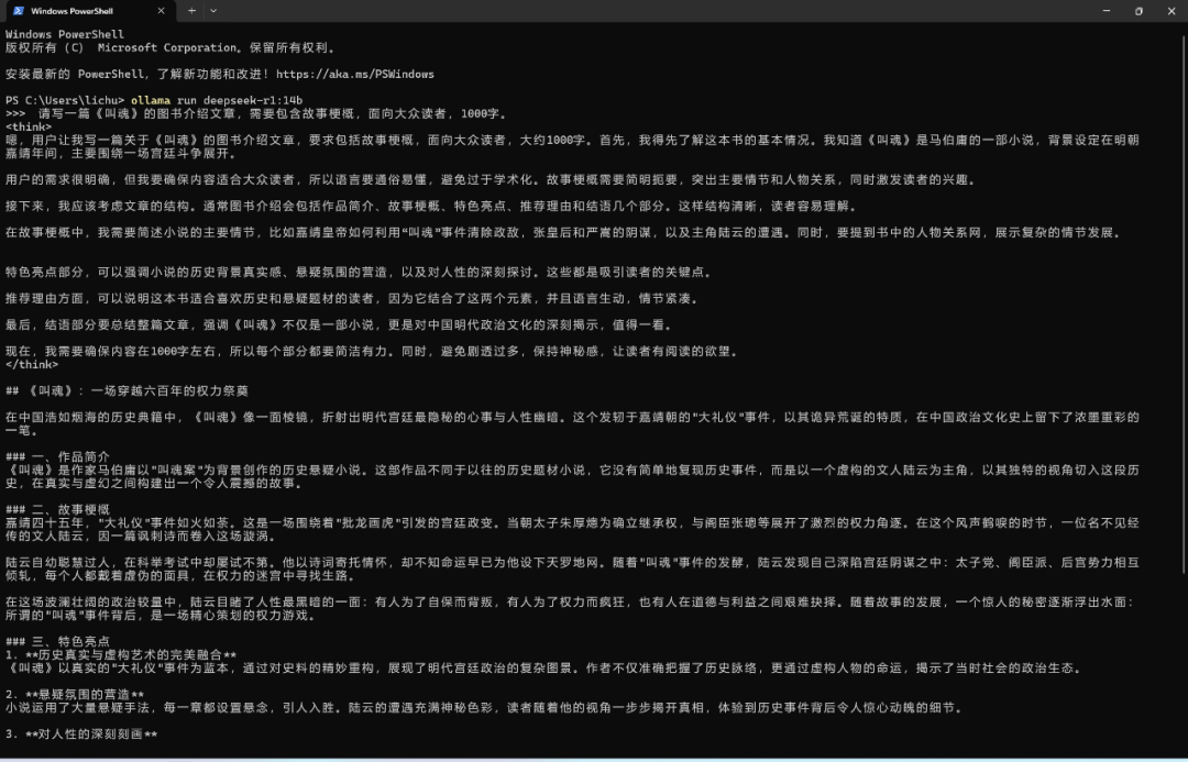 带着对DeepSeek的好奇,我让它生成了两篇图书介绍,图书的类型分别是小说(《月亮与六便士》)和历史(《叫魂》)。输入的指令都是“请写一篇《XXX》的图书介绍文章,需要包含故事梗概,面向大众读者,1000字。”